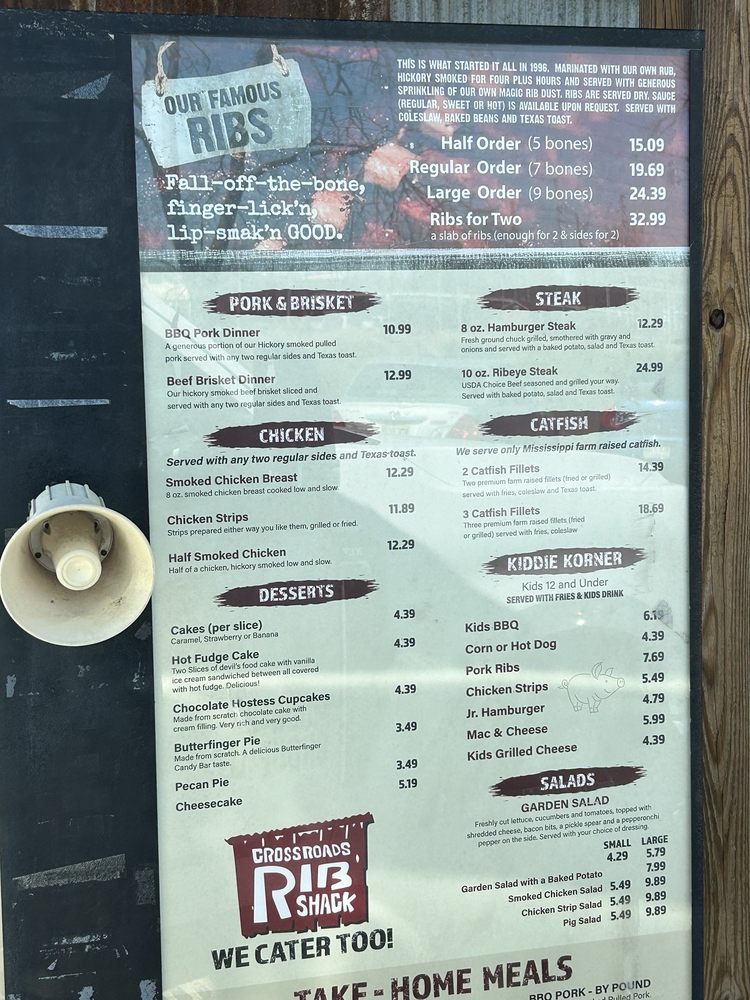 Crossroads Rib Shack, a New American and Barbeque eatery in Corinth, MS, offers a casual yet classy dining experience. With options for takeout, reservations, delivery, and catering, they cater to a variety of dining needs. The menu features traditional BBQ favorites like ribs and brisket, as well as unique dishes that showcase their culinary creativity. The restaurant is family-friendly, with options for kids and ample seating for groups. Convenient amenities like private parking, outdoor seating, and Wi-Fi make dining here a breeze. Whether you're craving a laid-back meal with friends or a special occasion celebration, Crossroads Rib Shack delivers on flavor and atmosphere. Make a reservation or stop by for a memorable dining experience.